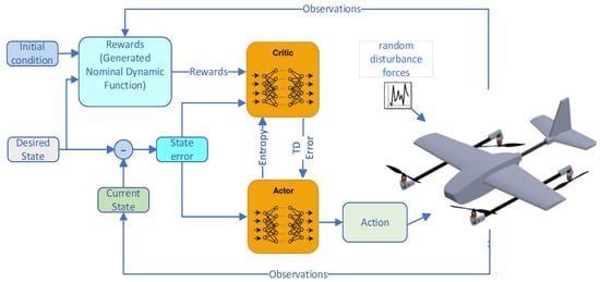 The control architecture of the system with RL is shown in Figure 9. Random desired references and initial conditions for the quad mode and fixed-wing flight mode were generated using a uniform distribution. Specifically, roll angles were sampled independently from [−0.4, 0.4] rad (≈±23°), pitch angles from [−0.3, 0.3] rad (≈±17°), and yaw angles (heading) from [−0.1, 0.1] rad (≈±5.7°). The initial values of roll, pitch, and yaw angles are also randomly selected within the same ranges. This allows moderate roll and pitch variations while keeping heading errors small, avoiding non-physical or infeasible flight states.