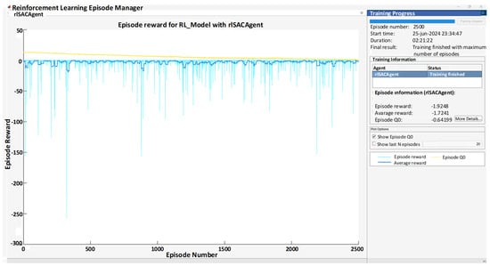 In the single-agent case, training with the SAC algorithm lasted for 2500 episodes, corresponding to approximately 2 h and 21 min of simulation time. The agent achieved an average reward of −1.7, which represents the baseline performance for comparison with the multi-agent approach, as illustrated in Figure 10.