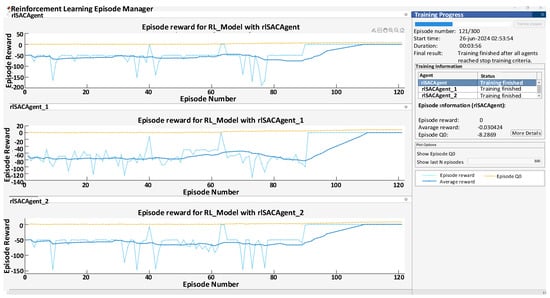Although improvements were observed with the single-agent SAC algorithm, a multi-agent implementation was adopted to further enhance vehicle stabilization. One of the simulation results obtained from applying the multi-agent SAC algorithm is presented in Figure 11. Notably, the training process was observed to be 98% shorter compared to the single-agent scenario. The corresponding training parameters are summarized in the table below. The multi-agent training lasted 121 episodes, taking 3 min and 56 s, with the average rewards recorded as −0.03, −0.057, and −0.022. Vehicle control was successfully achieved using the RL agents trained in these separate sessions, demonstrating both faster convergence and improved stabilization performance.
