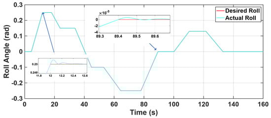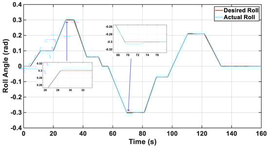 Axis control in fixed wing mode is shown in Figure 15, Figure 16 and Figure 17. Figure 15 illustrates the roll-axis tracking performance of the UAV in fixed-wing mode. As can be seen, the UAV generally follows the commanded roll angle. However, no significant overshoot or delay occurs during setpoint changes. This indicates that, although slight deviations are observed in the roll axis, the control algorithm maintains accuracy and stability.