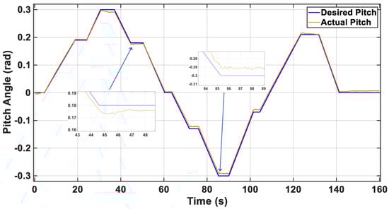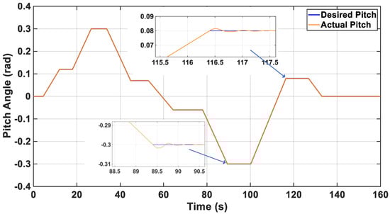Figure 13 illustrates the pitch tracking performance in quad-mode. The desired pitch trajectory (reference) is followed closely, with small transient deviations during setpoint changes and negligible steady-state error.
