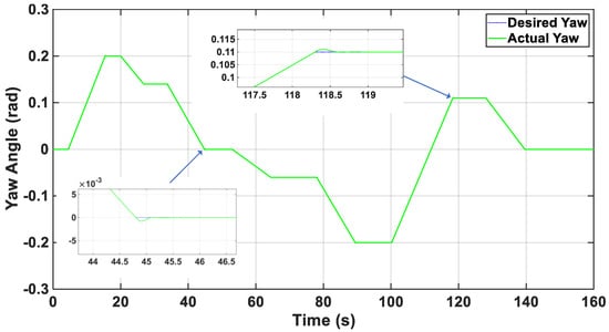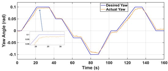 Figure 14 shows the yaw tracking performance in quad-mode. The desired yaw trajectory (reference) is tracked accurately, with minor transient deviations during setpoint changes and minimal steady-state error.