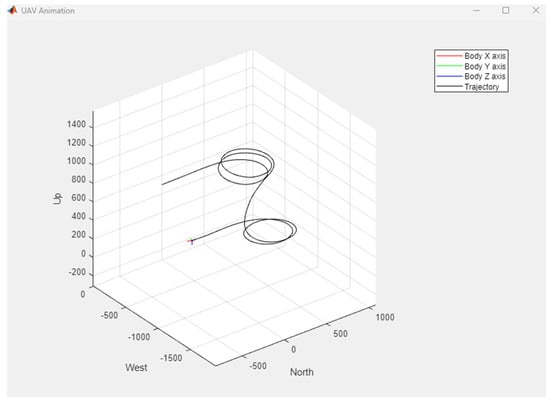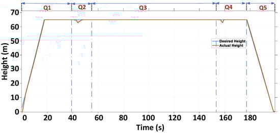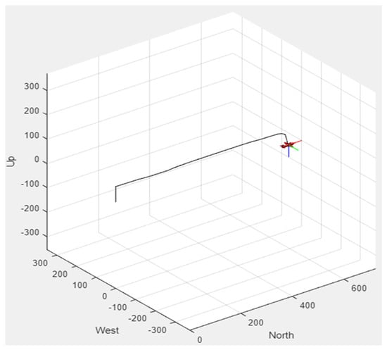 The vertical take-off, transition to horizontal flight, fixed-wing motion, transition back to vertical flight, and vertical landing of the Tilt Rotor fixed-wing UAV were carried out as follows. In Q1, the vehicle performed a vertical take-off in quadcopter mode and reached the target altitude. To achieve the required speed for switching to fixed-wing mode, it accelerated forward while moving horizontally in quadcopter mode during Q2. In Q3, the vehicle maintained stable motion in fixed-wing mode. During Q4, preparations for vertical landing were conducted as the vehicle transitioned back to quadcopter mode. Finally, in Q5, the operation concluded with a vertical landing in quadcopter mode. The entire sequence is illustrated using two complementary visualizations: the altitude (H) profile in Figure 18 and the MATLAB UAV Animation (version 2023b) in Figure 19.