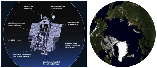 (left) SUNRISE III front view. Credit: MPS. (right) SUNRISE III trajectory, from ESRANGE to north Canada. Credit: CSBF.