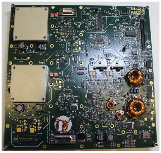The PCM’s envelope measures 250 × 250 × 40 mm, including the populated double-sided PCB. The allocated mass of that PCB was 1.0 kg, with a target of 0.85 kg. The PCM had to be mechanically attached using M3 screws. Both, the TuMag and SCIP PCMs share a common layout, maintaining compatibility within the designated envelope. While several components’ references are shared between both PCMs, some differ to suit the specific needs of each subsystem and load requirements.