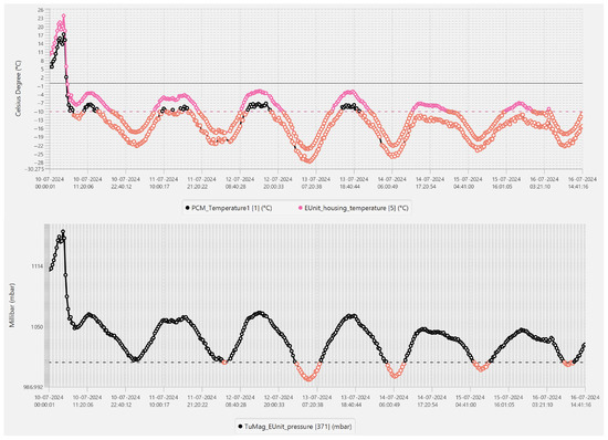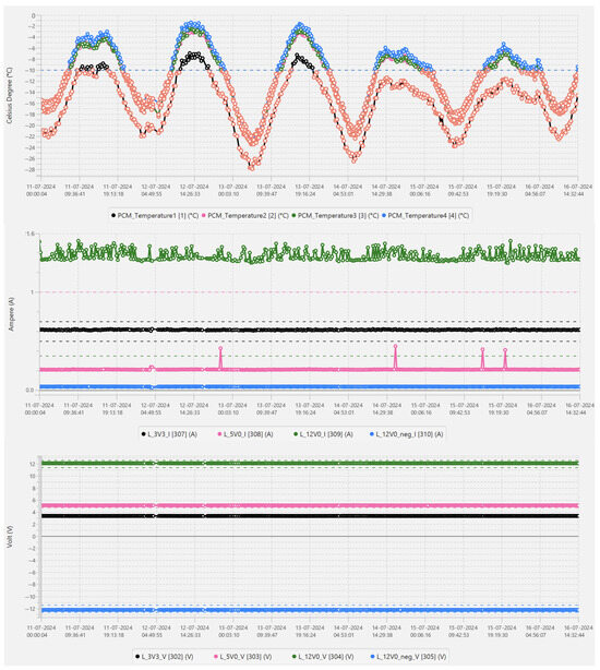 The environmental specifications for the E-Unit were mainly driven by the thermal conditions encountered during ascent, as well as the ambient pressure sustained throughout the flight. The ascent phase of a stratospheric balloon typically spans, depending on the float altitude, between one and four hours, a relatively short period in contrast to the overall mission duration. The study of the ascent phase is a key point from the thermal point of view, where several parameters have to be considered [31]. During this phase, the payloads are subjected to extremely harsh conditions, primarily resulting from the convective cooling that occurs as the balloon moves through the cold atmosphere, where minimum temperatures are encountered in the tropopause (around 10–20 km). In fact, the predicted atmospheric air temperature drops below −50 °C (even down to −70 °C). The temperature profile during the ascent phase is extremely dependent on the launch site, the epoch, the height of the floating phase, and the launch time [32,33,34,35]. In fact, in general, the height range of the troposphere depends to a large extent on the geographical situation, the season and the meteorological situation [36].