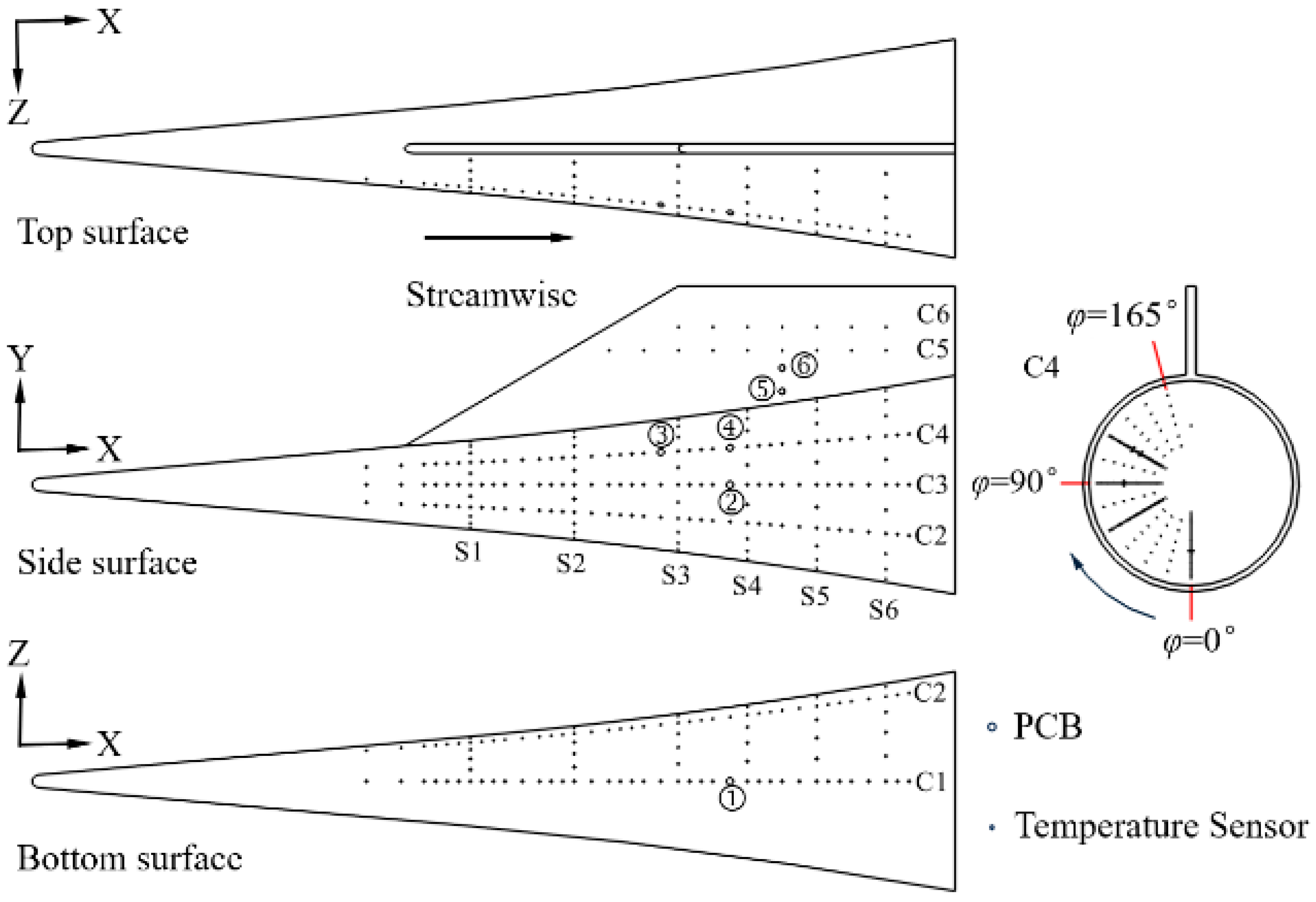 AoA values (−6°, −3°, 0°, 3°, and 6°). To facilitate comparison with quantitative data obtained from sensors, their locations are marked in the temperature rise contour maps. The results indicate that