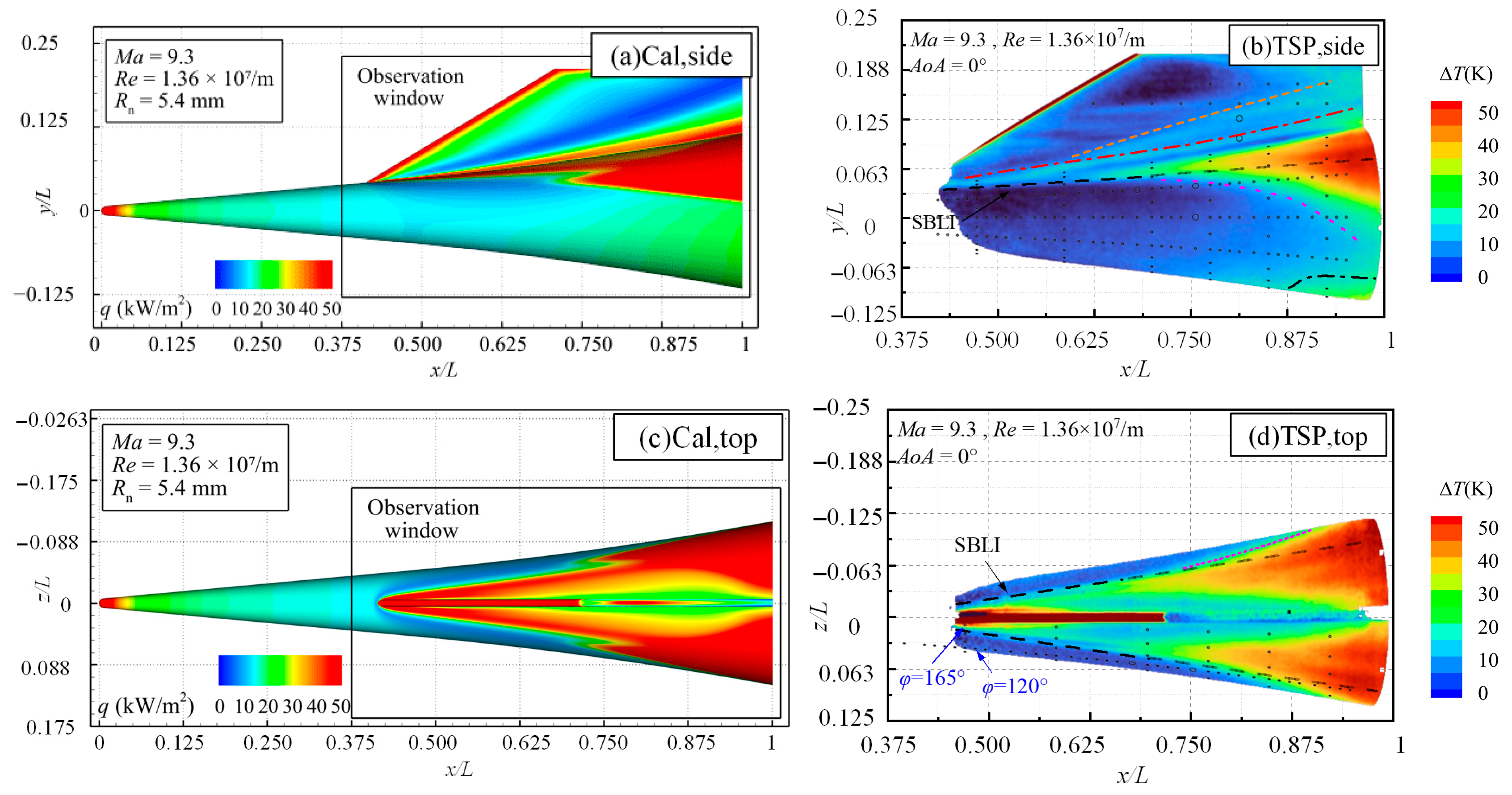 Figure 8 presents the TSP results on the side and top surfaces of the flared cone–swept fin configuration at