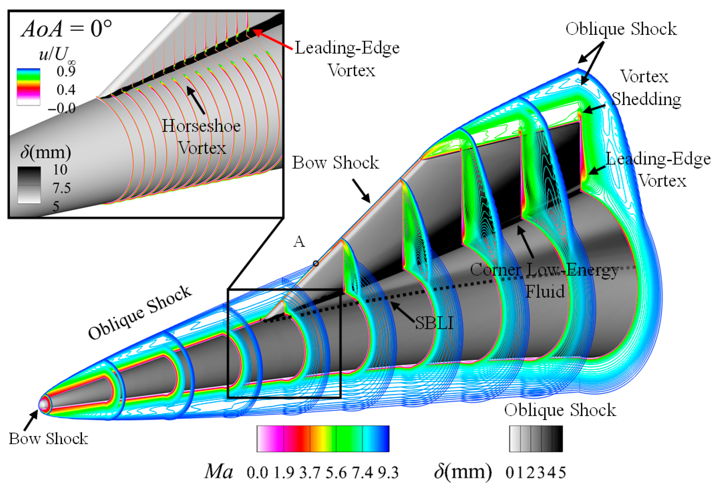AoA. ③ Shock–boundary Layer Interaction Region (SBLIR), distributed primarily at the junction between the flared cone and the swept fin, relatively stable under 0°