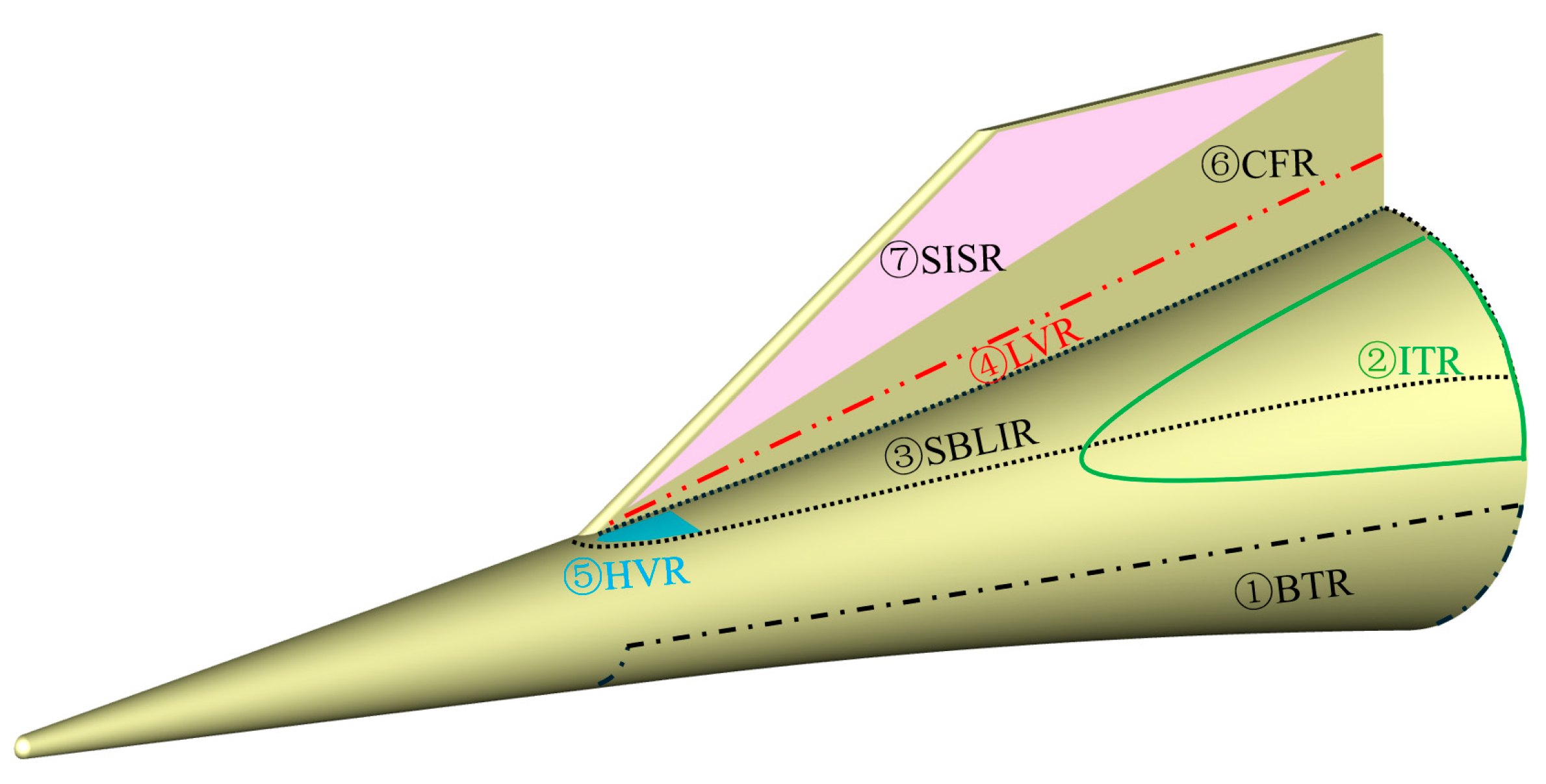 AoA. ④ Leading-Edge Vortex Region (LVR), located near the intersection of the swept fin leading edge and the flared cone. ⑤ Horseshoe Vortex Region (HVR), distributed along the flared cone surface near the swept fin root. ⑥ Crossflow Transition Region (CFR), associated with crossflow instability on the swept fin. ⑦ Shear-Induced Streak Region (SISR), located between the swept fin leading edge and the crossflow region.