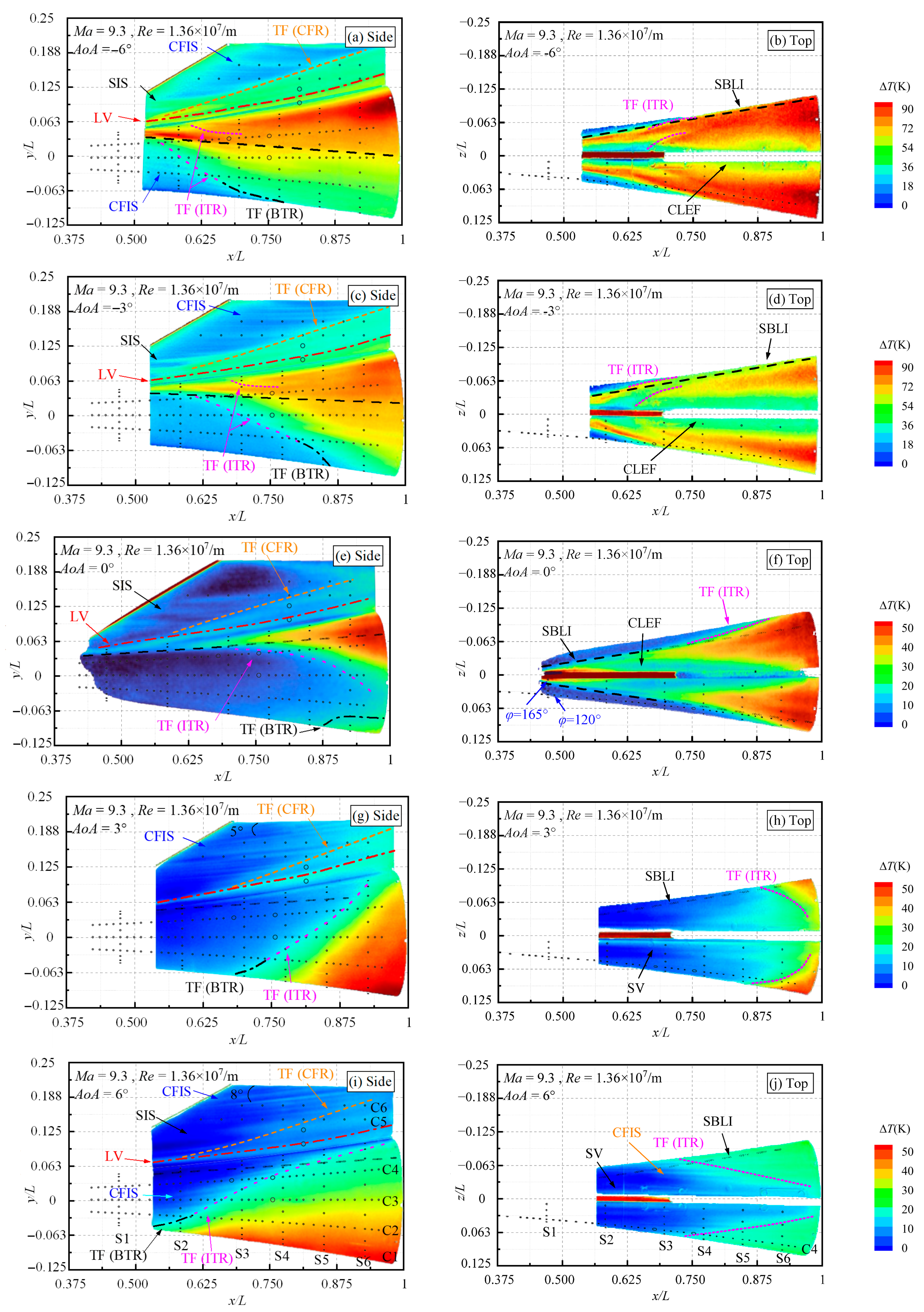 In the BTR, at AoA = 0°, transition initiates around x/L = 0.875, yet the boundary layer does not achieve a fully turbulent state by the model’s trailing edge. As the AoA decreases to −3°, surface temperatures rise, and the transition onset moves slightly downstream to x/L ≈ 0.9, forming an extended transition region (green area). A further decrease in AoA to −6° advances the onset location to approximately x/L = 0.775, with the transition region widening, though the boundary layer still does not achieve a fully turbulent state. At positive AoA, the transition onset in the BTR moves significantly upstream. At AoA = 3°, the onset moves upstream to approximately x/L = 0.688, with the boundary layer transitioning from laminar to turbulent. When the AoA increases to 6°, the transition onset moves further upstream to approximately x/L = 0.538. These findings indicate that both positive and negative AoAs promote earlier transition in the BTR. However, the observed transition pattern differs from the typical distribution seen on simple geometries, where transition onset is generally delayed on the windward side and advanced on the leeward side.