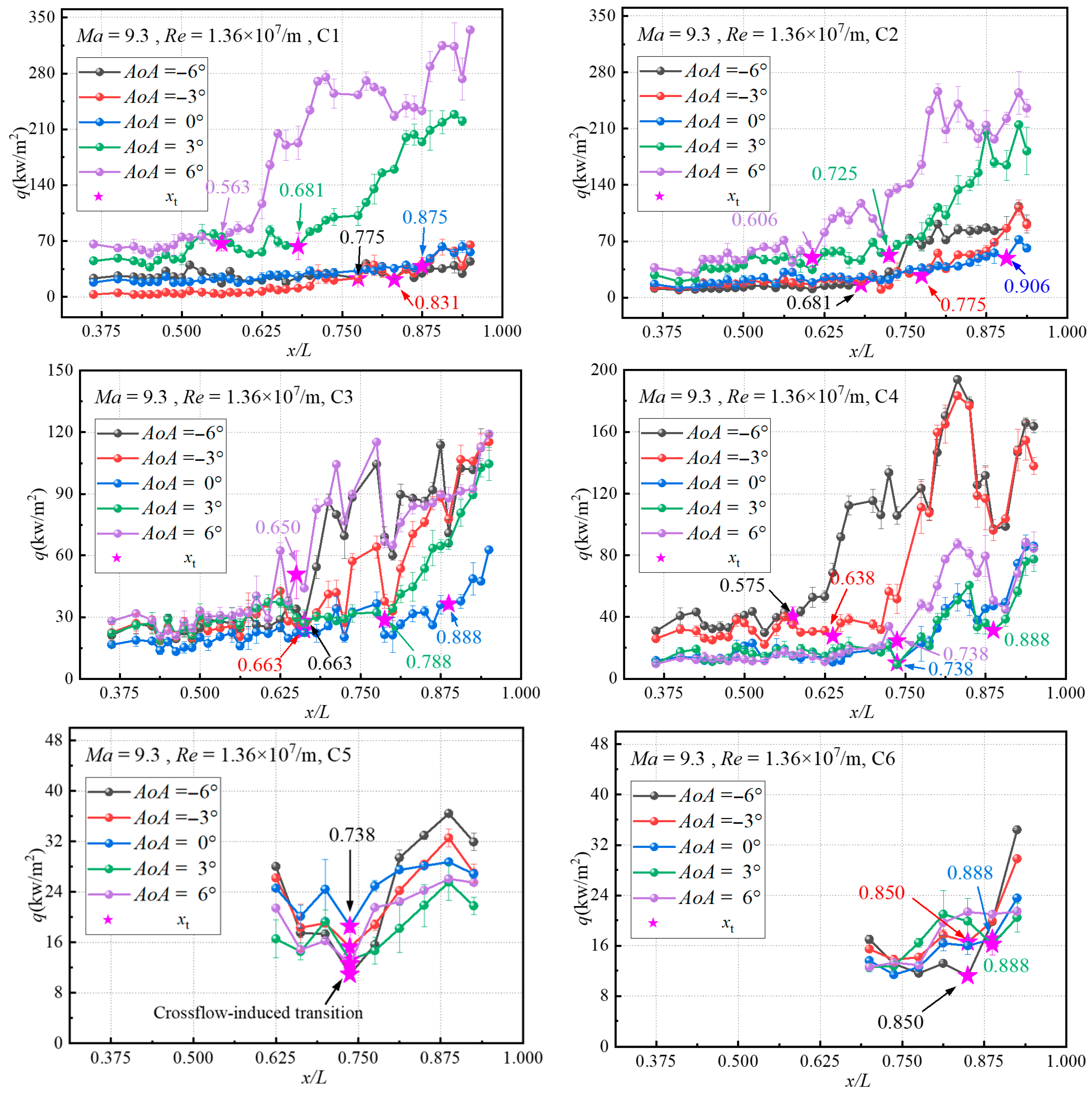 C2 is located along the φ = 60° streamline. At AoA = 0°, the downstream heat flux increases due to the influence of transition in BTR, with xt identified at 0.906. When AoA decreases to −3° and −6°, the heat flux in the laminar region at C2 remains relatively unchanged, but xt shifts upstream to 0.775 and 0.681. As AoA increases to 3° and 6°, the laminar heat flux at C2 gradually rises, with xt advancing to 0.725 and 0.606, respectively. Despite the upstream shift in transition, the peak turbulent heat flux at C2 is consistently lower than that at C1, with reductions of approximately 20–50 kW/m2 across all AoA conditions.