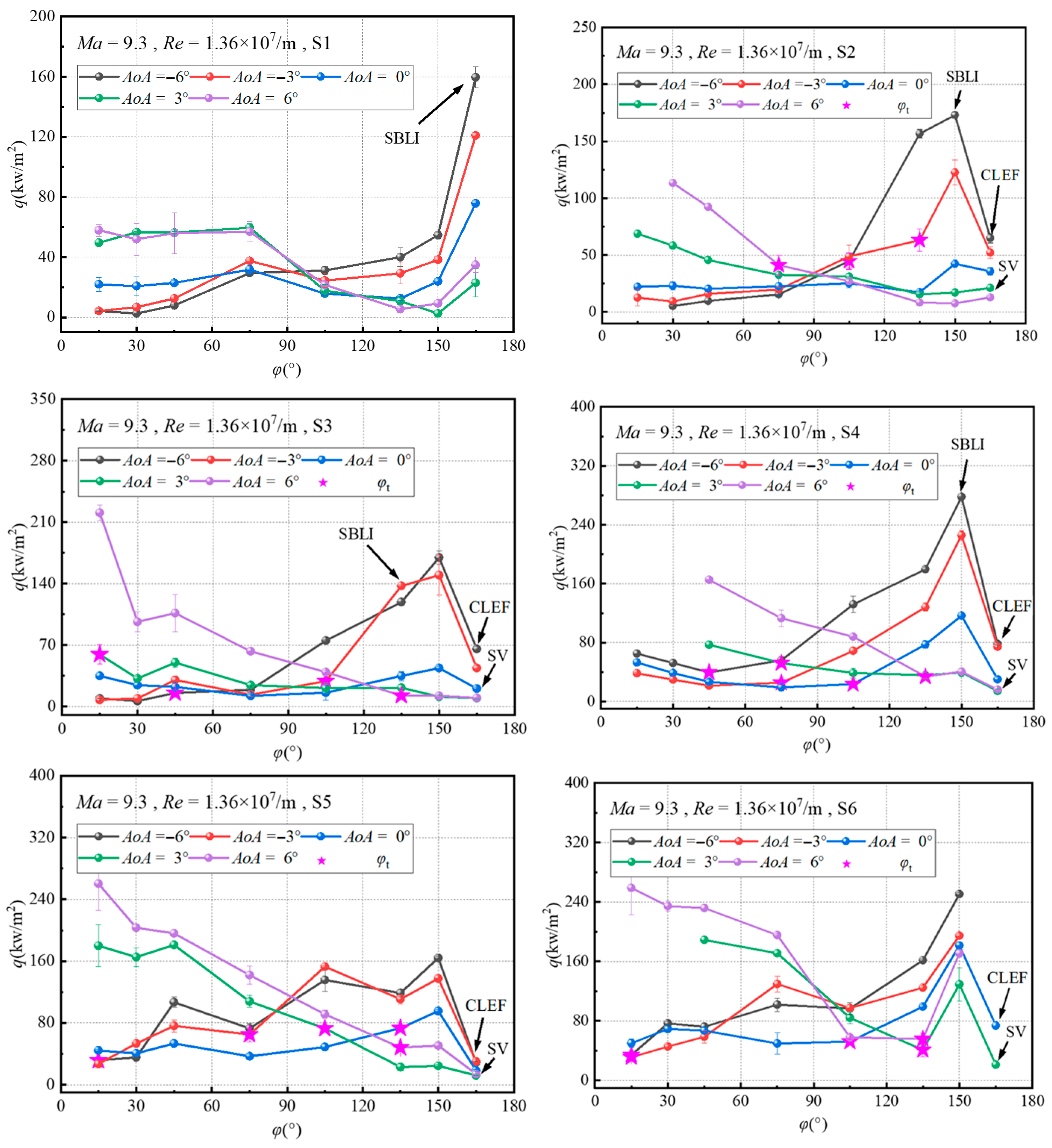 S4 is located at x = 620 mm. At AoA = 0°, the BTR shows signs of transition development. At negative AoA, the region is in the transition development stage. At AoA = −3°, a transition trend is observed, but the heat flux level is lower than that under AoA = 0°. When the AoA further decreases to −6°, the heat flux exceeds that at AoA = 0°, with a noticeable rise at φ = 135° due to SBLI effects. At positive AoA, the region is fully turbulent. Along the circumferential direction, the heat flux increases at φ = 135° due to SBLI, but the magnitude of the increase remains lower than that at negative AoA. At φ = 165°, the heat flux decreases due to the influence of the separation vortex.