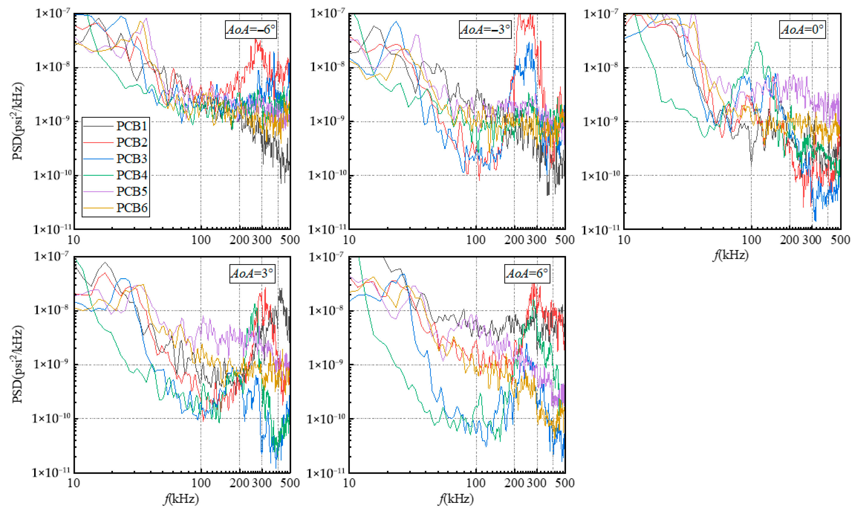 Figure 11 presents the power spectral density (PSD) distributions of pressure fluctuations measured by the six PCB sensors under different