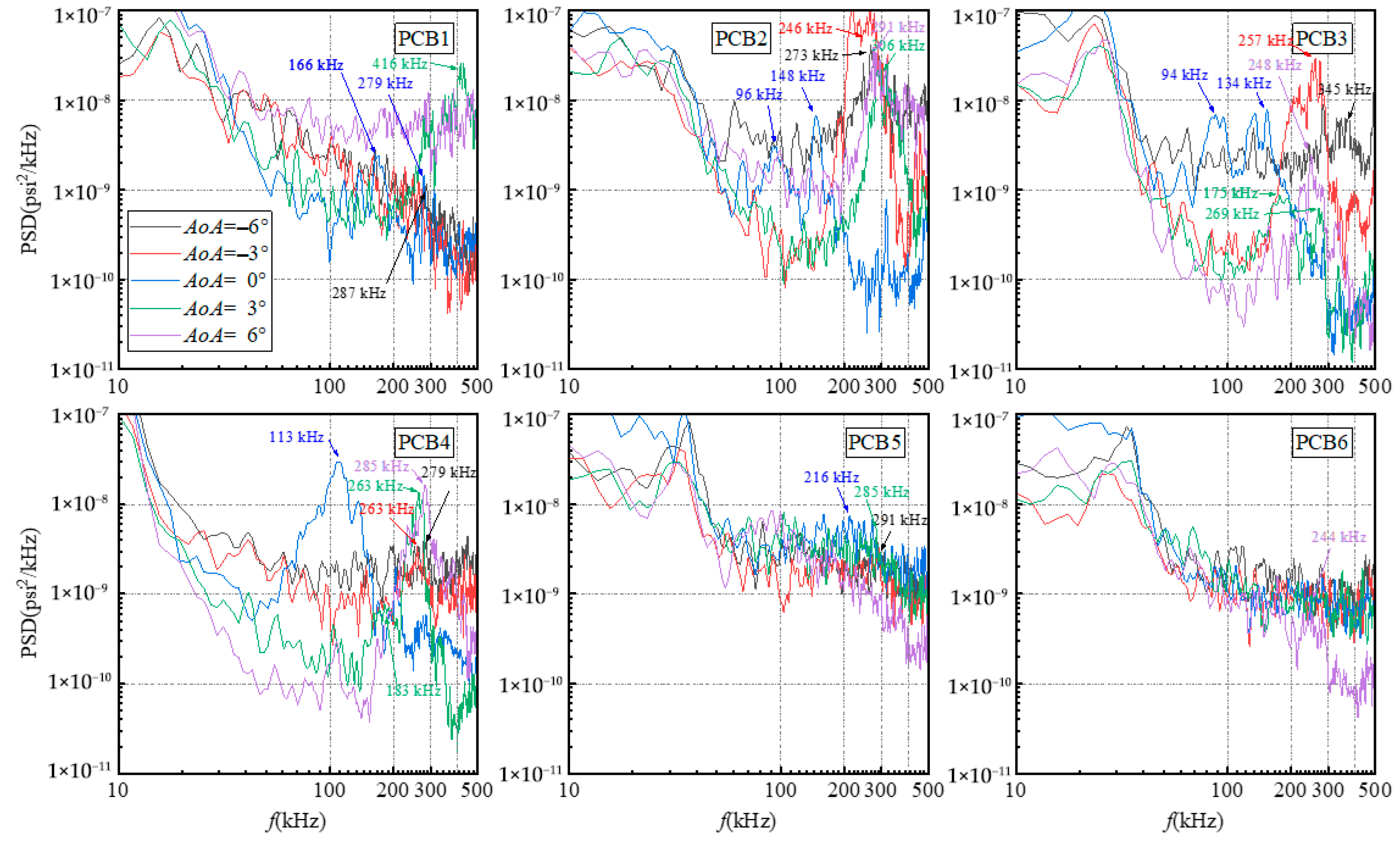 At AoA = −3°, compared to the AoA = 0° case, the disturbance frequencies at some sensor locations shift toward higher frequencies, and high-amplitude second-mode instabilities are observed at multiple locations. PCB1, positioned upstream of the transition front on the BTR, exhibits generally weak spectral content with no prominent peaks. At PCB2, positioned within the transition region, a pronounced second-mode disturbance emerges with a dominant frequency around 246 kHz. PCB3, positioned at the junction between the SBLI boundary and the ITR transition front, displays a broadband spectral response centered at 257 kHz. PCB4, positioned in the turbulent region near the downstream end of the SBLI boundary, records a dominant frequency of approximately 263 kHz, indicating a transition into fully developed turbulence. At PCB5, within the intensified leading-edge heat flux streak, disturbance frequencies range from 146 to 291 kHz. PCB6, positioned in the crossflow region, shows spectral characteristics indicative of turbulence development.