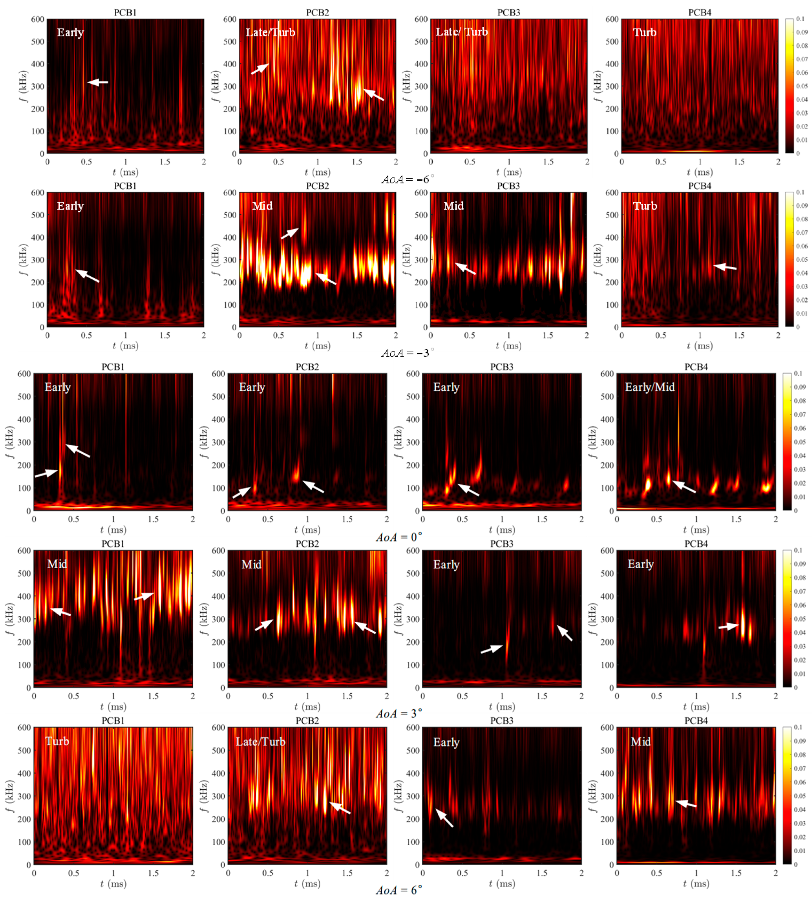 At AoA = 6°, disturbance amplitudes increase further compared to the 3° condition. At PCB1, located on the windward side, the wavelet map exhibits a more uniform frequency distribution, with pronounced high-frequency responses and overall amplitude amplification, displaying typical turbulent characteristics. At PCB2, a sustained high-energy wave packet emerges around 300 kHz, with distinct high-frequency streaks and relatively stable amplitude. The overall response is characterized by a broad, high-amplitude, and nearly uniform distribution, suggesting that this region has likely entered the late transition stage or is approaching turbulence, as indicated by the TSP data. At PCB3, disturbance amplitudes remain relatively weak, with several continuous streaks appearing within the 150–400 kHz band. Although the signals exhibit some temporal continuity, localized energy remains low, indicating the early stage of transition. At PCB4, disturbance intensity further increases, forming a sustained high-frequency streak near 300 kHz with consistent frequency response and slightly elevated amplitude, indicating the mid-transition stage.