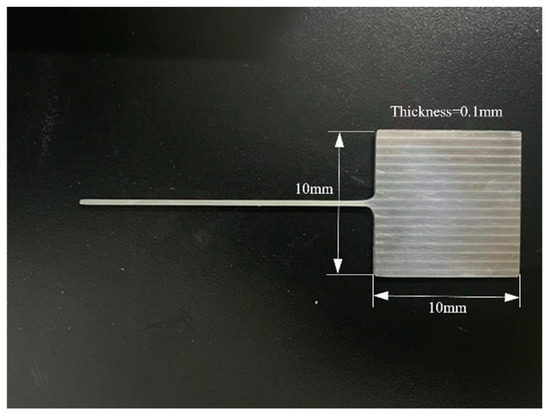 A conventional three-electrode electrochemical setup was employed for the experiments. The electrolytic cell featured a PTFE liner with an outer shell made of 304 L stainless steel. In contrast to commonly used encapsulation techniques such as epoxy potting or welding, the working electrode (Figure 2) was fabricated integrally from the Al–Li alloy base material, with dimensions of 5 cm × 5 cm, and incorporated seamlessly connected wiring from the same material. A platinum wire and a platinum mesh were used as the reference electrode and counter electrode, respectively. Electrochemical measurements were conducted using an Ivium-Stat multichannel electrochemical workstation (Ivium Technologies, Eindhoven, The Netherlands), housed within a Wuhan Koster Faraday shielding chamber (25 cm × 30 cm × 25 cm) to minimize external electromagnetic interference. Prior to each potentiodynamic scan, the open-circuit potential was monitored until a stable value was obtained. Polarization curves were then measured at a scan rate of 1 mV/s. Following electrochemical testing, the specimens were examined using SEM to characterize the surface corrosion morphology.