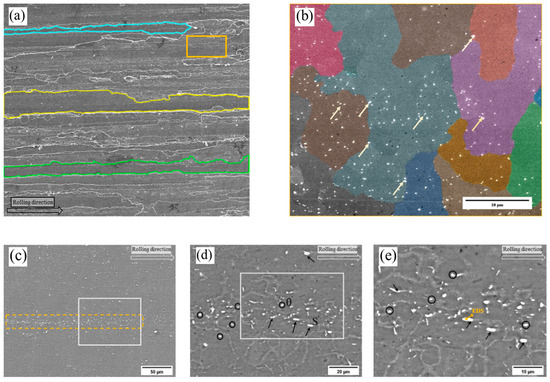 Figure 3 illustrates the microstructure of the 2195-T8 Al-Li alloy surface. As depicted by the polygonal outlines in Figure 3a, the grains exhibit elongation along the rolling direction. A higher-magnification view of the region marked by the orange rectangle in Figure 3b reveals that the microstructure consists of both original coarse grains and equiaxed recrystallized grains. In the color-marked recrystallized grains, micron-sized Cu-rich or Fe-rich precipitates (indicated by arrows) exhibit selective enrichment or depletion, resulting in a heterogeneous distribution. As shown in the backscattered electron (BSE) images (Figure 3c–e), bright clusters of intermetallic particles are aligned along the rolling direction within the region marked by the dashed box. Elemental analysis of the intermetallic particles indicated by the yellow arrows was conducted using energy-dispersive spectroscopy (EDS). The results revealed that the particles were composed of 78.51% Al, 12.42% Cu, 6.59% Fe, 1.92% Ag, and 0.56% Mg. Notably, the content of heavy metal elements is relatively high. The distribution and chemical composition of such intermetallic particles significantly influence the corrosion resistance of the alloy, and may induce various forms of localized corrosion, thereby degrading the mechanical properties of the 2195-T8 Al-Li alloy.