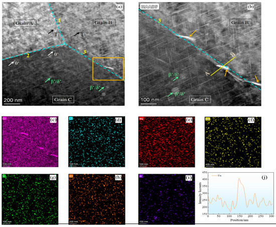 (a) TEM-HADF image depicting the precipitate distribution in the alloy; (b) higher magnification of the area enclosed in the orange box shown in (a); (c–i) EDX mapping of the various elements in (b); (j) Cu distribution along the line A-B shown in (b).