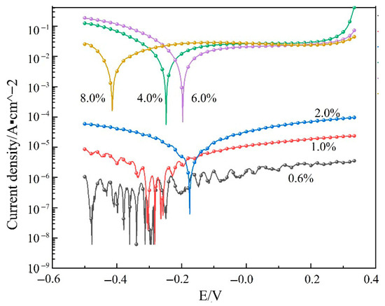 Under conventional storage conditions, N2O4 exists primarily in the liquid phase. However, electrochemical testing of as-delivered N2O4 is challenging due to its low initial water content. Furthermore, the partial reaction between N2O4 and H2O results in a multiphase system, which prevents the establishment of a stable current loop necessary for reliable electrochemical measurements. Therefore, based on previous work conducted by the research group and with reference to the GJB1673-93 standard [15], which confirms the suitability of N2O4 as a test medium, an improved electrochemical testing method was employed to obtain polarization curves of the 2195-T8 Al-Li alloy in N2O4 containing varying water contents: ω(H2O) = 0.6%, 1.0%, 2.0%, 4.0%, 6.0%, and 8.0%.