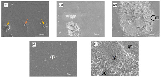 Moreover, localized exfoliation corrosion is evident on the specimen surface, accompanied by the detachment of a small fragment of the matrix. As shown in Figure 6c, both the corroded region and the area of substrate detachment expanded with the progression of corrosion. The severely corroded zone (indicated by the circle in Figure 6c) and its adjacent region (marked by the square in Figure 6c) were magnified for detailed examination. Figure 6d reveals a granular lattice morphology on the specimen surface, with numerous precipitated products dispersed throughout, denoted as zone ①.