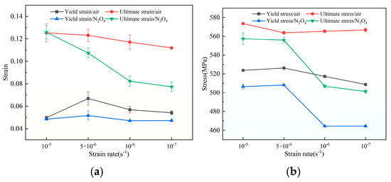 (a) Changes in the alloy’s yield strain and ultimate strain under varying strain rates and media conditions; (b) changes in the alloy’s yield stress and ultimate stress under varying strain rates and media conditions.
