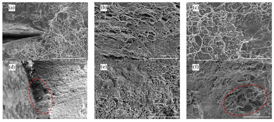 Typical fracture morphology of 2195-T8 Al-Li alloy tested in the two different environments: (a) Air/ε = 10−6 s−1; (b) Air/ε = 10−6 s−1; (c) Air/ε = 10−6 s−1; (d) N2O4/ε = 10−6 s−1; (e) N2O4/ε = 10−6 s−1; (f) N2O4/ε = 10−6 s−1.