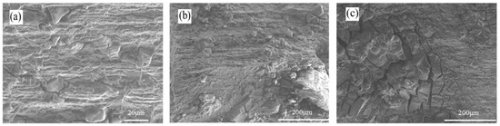2195-T8 Al-Li alloy fracture morphology of different ω(H2O)N2O4: (a) ω(H2O) = 1.0%; (b) ω(H2O) = 2.0%; (c) ω(H2O) = 6.0%.