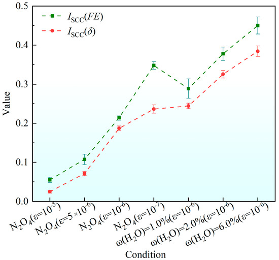 At the same strain rate, the ISCC values—evaluated both by fracture energy (FE) and critical crack opening displacement (δ)—exhibited an increasing trend with rising water content ω(H2O) in the N2O4 environment. Prolonged immersion in N2O4 promotes the formation of a substantial oxide layer on the alloy surface, which provides a certain degree of corrosion inhibition.