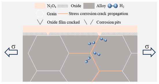 On the one hand, the tensile stress will affect the bonding force between the oxides and the matrix, which will make these oxides more easily detached from the matrix. On one hand, tensile stress weakens the bonding force between the oxides and the matrix, promoting the detachment of these oxides. On the other hand, according to our previous study [28], an increase in the H2O content (ω(H2O)) in N2O4 significantly accelerates the reaction between N2O4 and H2O, leading to increased production of HNO3 and HNO2. These acidic products enhance localized corrosion, facilitate the formation of corrosion defects, and induce stress concentration. This process is further supported by the electrochemical corrosion rates presented in Table 2.