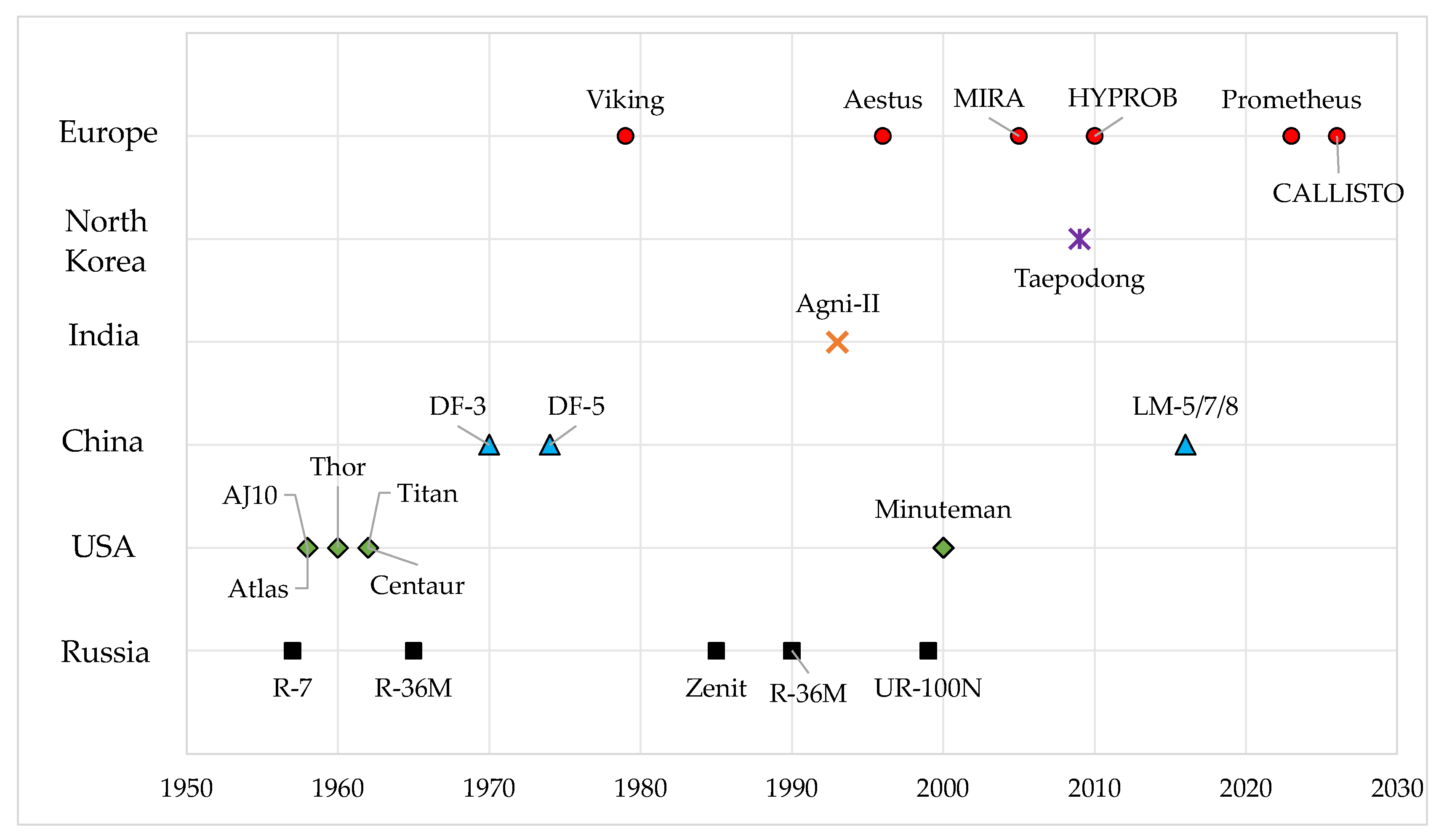 - The Engines of Ariane 6. European Space Agency (ESA). Available online: https://www.esa.int/Enabling_Support/Space_Transportation/Ariane/The_engines_of_Ariane_6 (accessed on 15 July 2025).