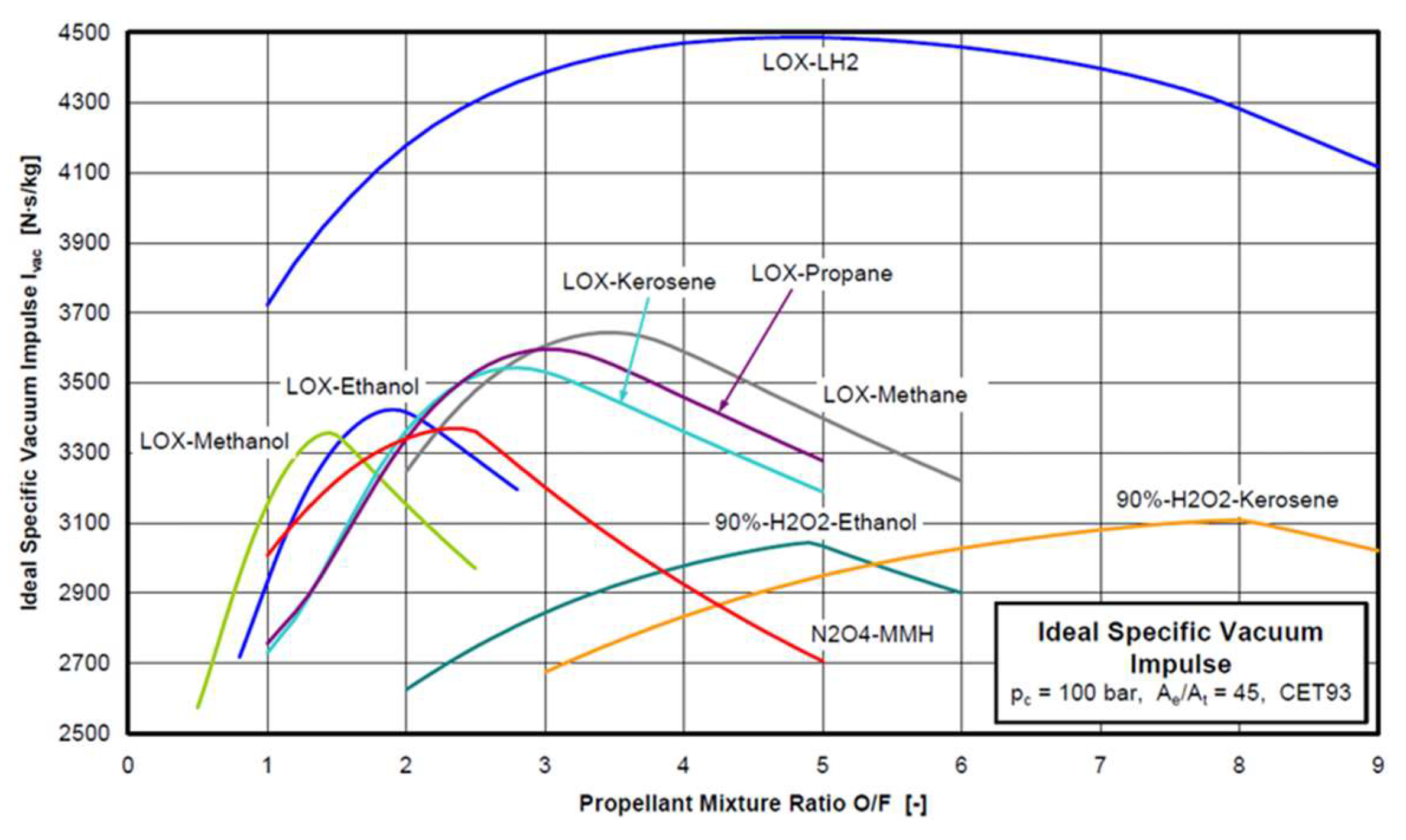 - LOX-LCH4 burns cleaner and emits only water (H2O) and carbon dioxide (CO2), with significantly less unburnt hydrocarbons and particles;