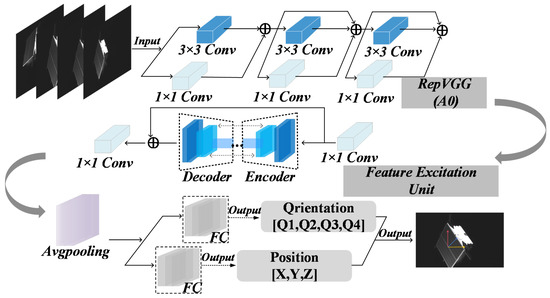 - This paper proposes a feature excitation unit (FEU) consisting of an encoder and decoder. The encoder compresses spatial redundancy, reinforces spatial features, and improves spatial semantic expression. The decoder further enhances channel feature expression and adds a skip connection between the encoder and decoder to enhance the model’s ability to capture the detailed contours of the spacecraft. The model inference stage only requires a 1 × 1 convolution to achieve dual-domain feature interaction, which greatly improves the accuracy of pose estimation without significantly increasing the number of model parameters.