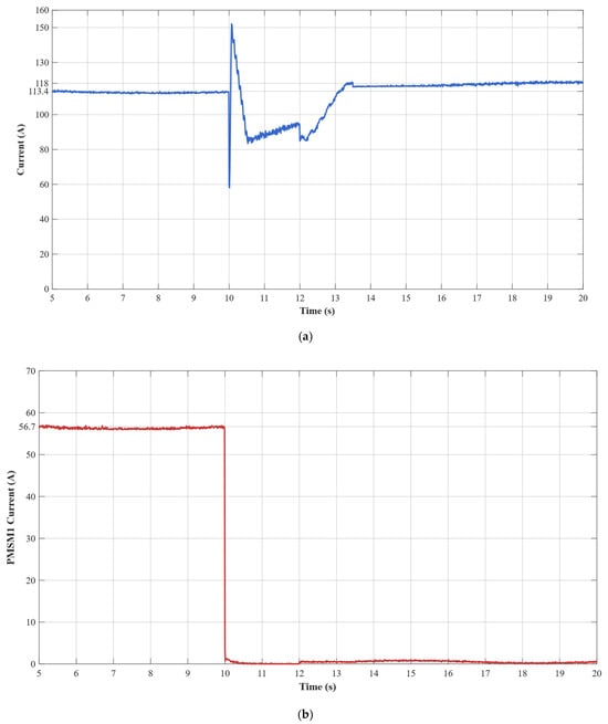 Figure 15 shows the detailed current variation characteristics during the fault switching process. During normal operation, both motors maintain a current of 56.7 A and equally share the system output power, each carrying 120 N·m of torque. At t = 10 s, the current in PMSM 1 instantly drops to zero, and the motor stops. Meanwhile, PMSM 2 experiences a significant transient current overshoot due to a sudden double load. The peak current reaches 150 A, which is equivalent to 2.65 times the normal operating current. After a three-second dynamic adjustment process that considers the control system’s inherent steady-state error and nonlinear factors, PMSM 2′s steady-state current stabilizes at 118 A. This represents a 4% deviation from the theoretical double value of 113.4 A. PMSM 2 successfully carries the entire system output power, achieving single-motor fault-tolerant operation.
