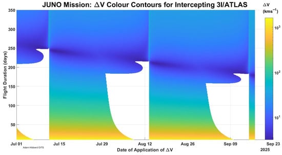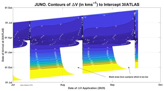 Direct Juno Mission, contours of V needed by Juno to intercept 3I/ATLAS; note there are two opportunities before the binary SPICE kernel data ends on 17 September 2025.