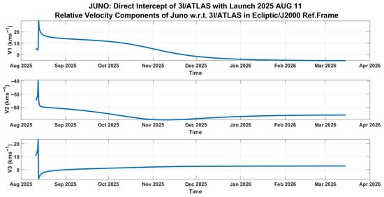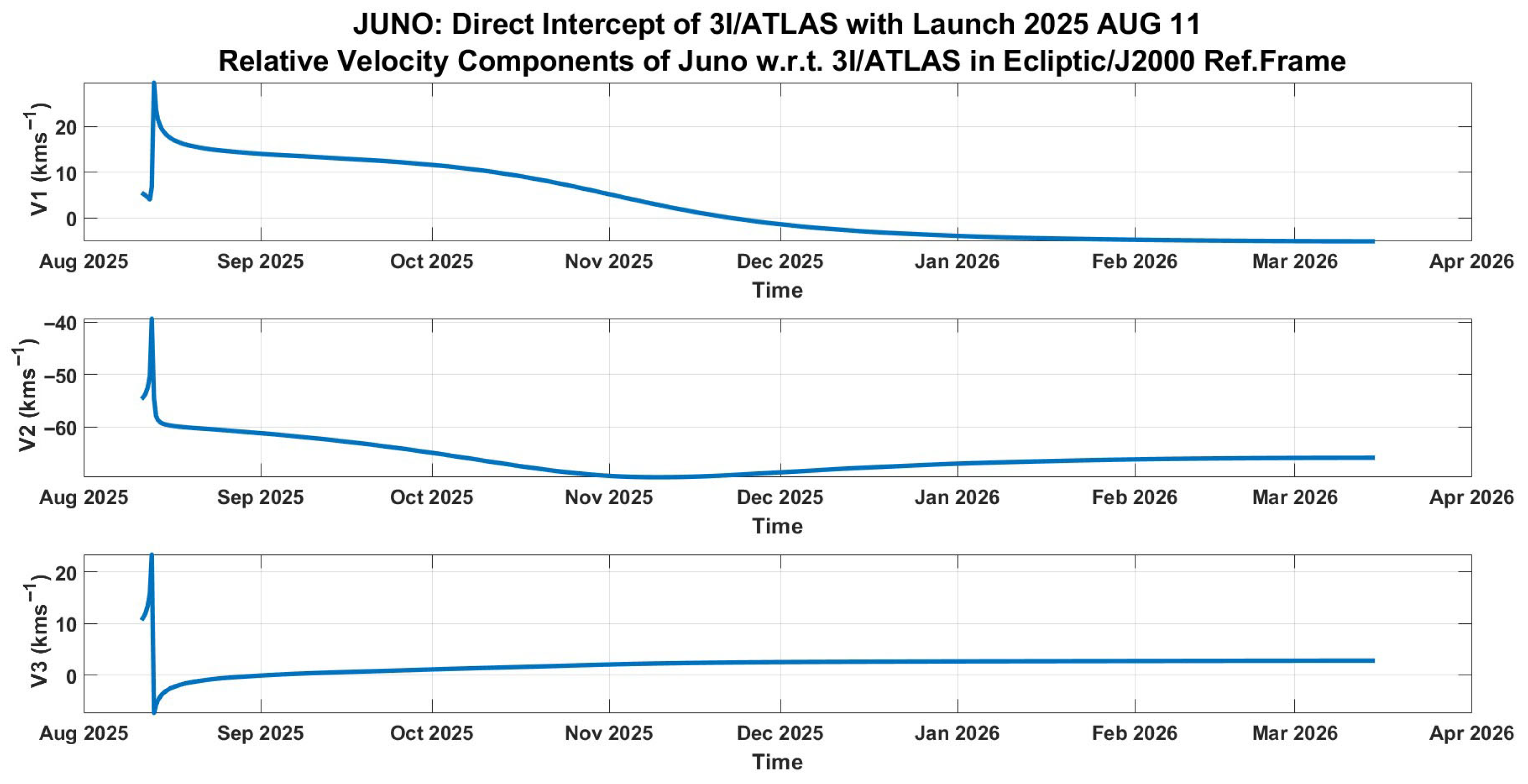 Reference mission: relative velocity components of Juno w.r.t. 3I/ATLAS in the NASA SPICE ECLIPJ2000 reference frame.