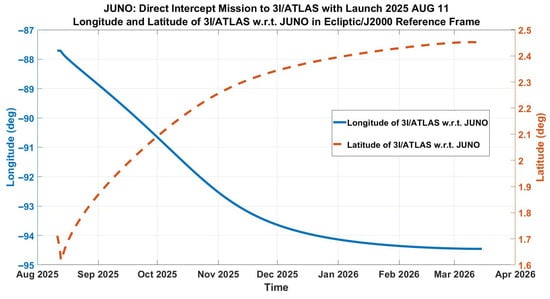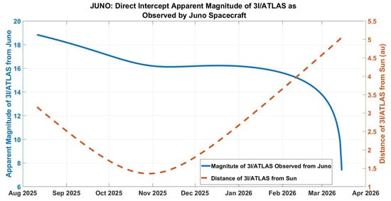 The opportunity shown in Table 1 has a ‘launch’ (henceforth defined as time of initial V application) of 11 August 2025, and in what follows, this will be the reference mission. Refer to Figure 3, Figure 4, Figure 5 and Figure 6, which provide the pertinent trajectory data for this reference mission, including an estimate of the brightness of 3I/ATLAS, as well as the necessary attitude of Juno for tracking the target. Further missions investigated follow similar profiles and so are not provided.
