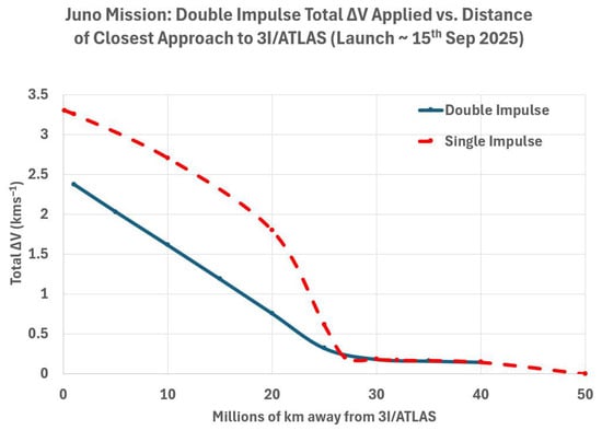 Double impulse scenario (assuming the opportunity around 15 September 2025) compared to the single impulse option, implying a significant reduction in required total V.
