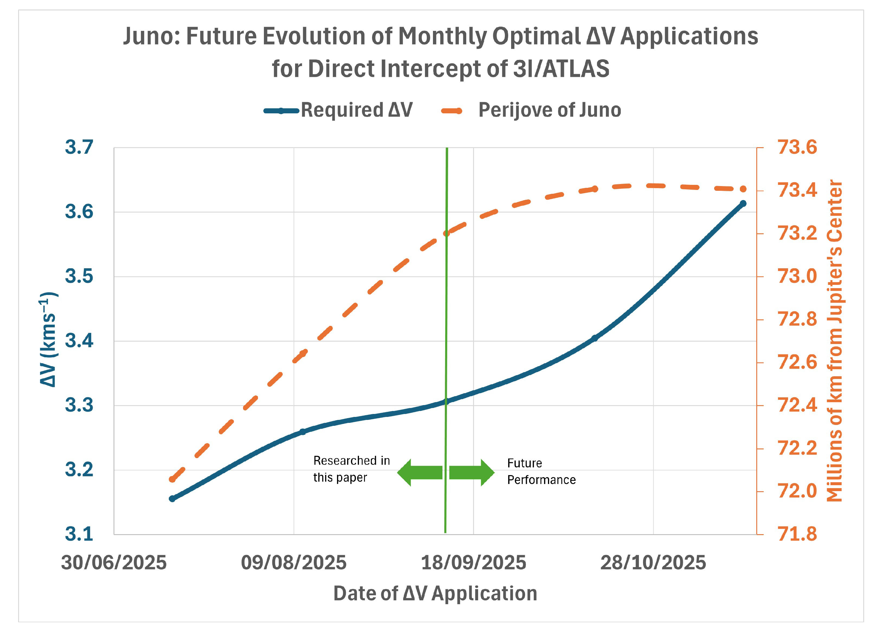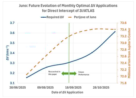As can be observed in Figure 12, the perijove of Juno ascended from July onwards and then plateaued in October/November. This implies that in the future, from November onwards, there will be no obvious benefit from Juno’s orbit in terms of reducing the applied V to arrive at 3I/ATLAS. In fact, if one refers to the plot of required V in this Figure, we find that this important metric of feasibility continues quite steeply upwards despite this plateau in perijove, implying that it is indeed the first of the items above (lower flight durations due to the more imminent arrival of 3I/ATLAS) that is the overriding factor governing the viability of a mission to 3I/ATLAS. In short, the sooner Juno is ‘launched’ the better.