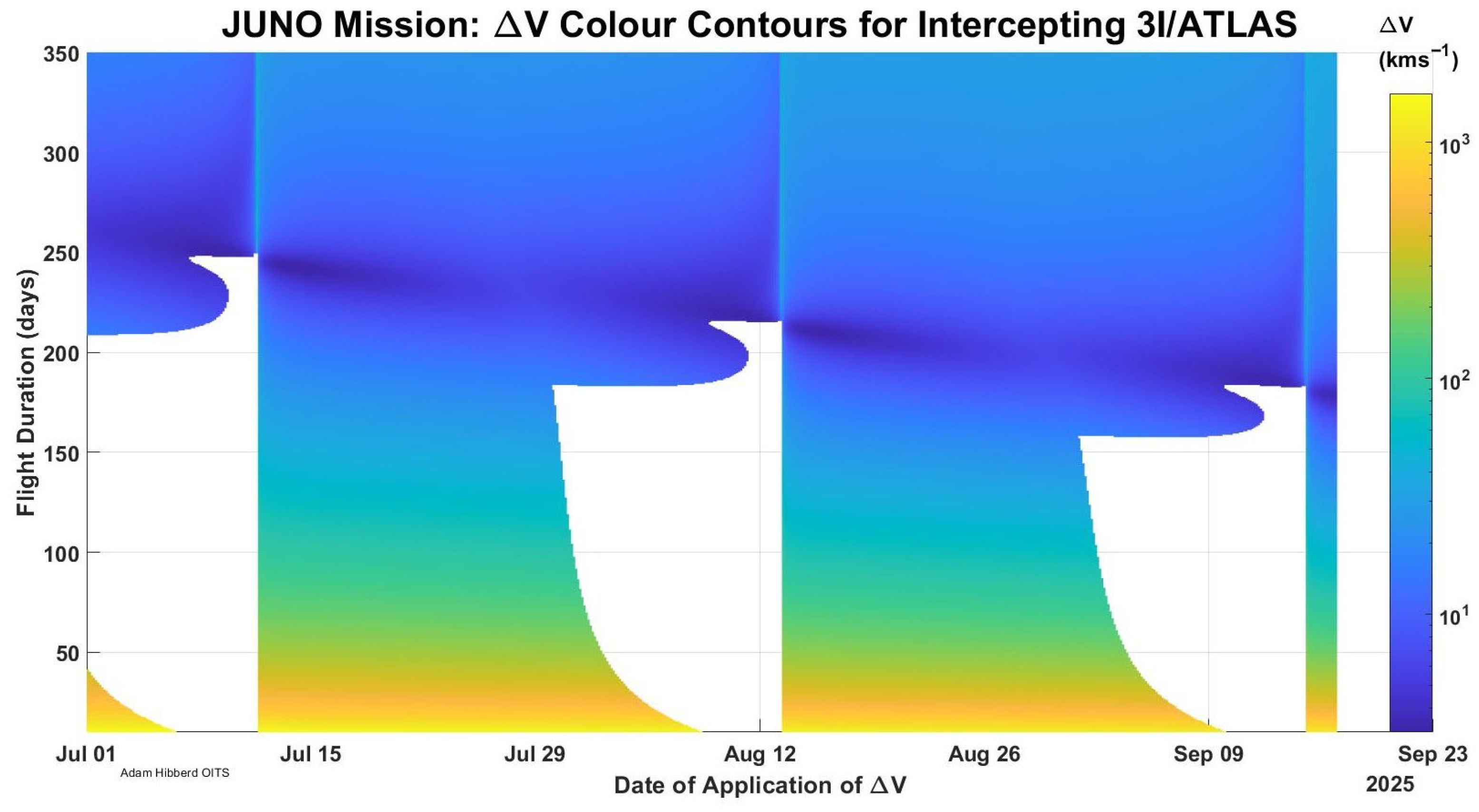 Direct Juno Mission, pork chop indicating required V for the JUNO spacecraft to intercept 3I/ATLAS (logarithmic scale).