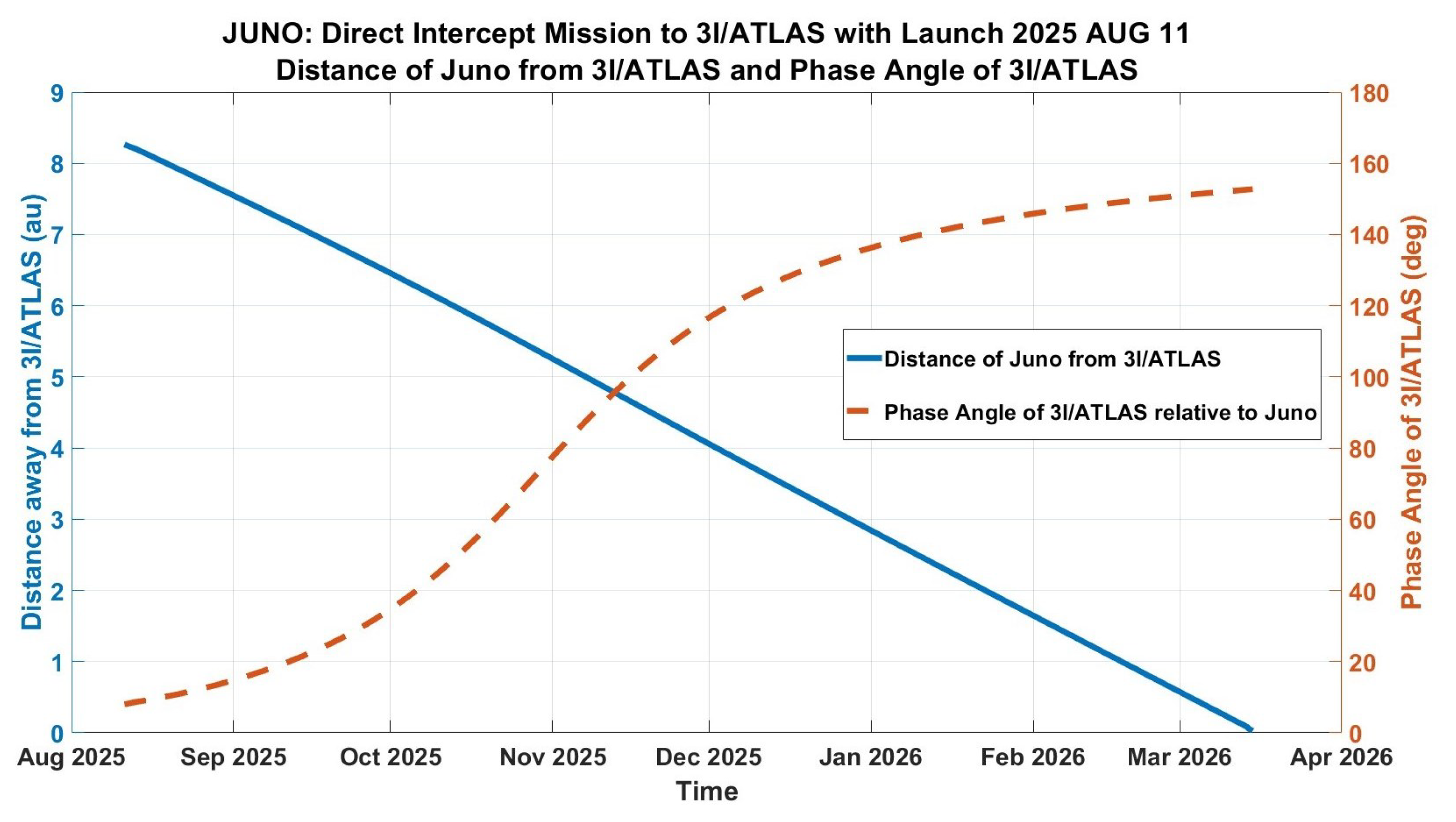 Distance of 3I/ATLAS from Juno and Phase of 3I/ATLAS w.r.t. Juno, for the reference mission (direct transfer) with a ‘launch’ on 11 August 2025 (refer text).