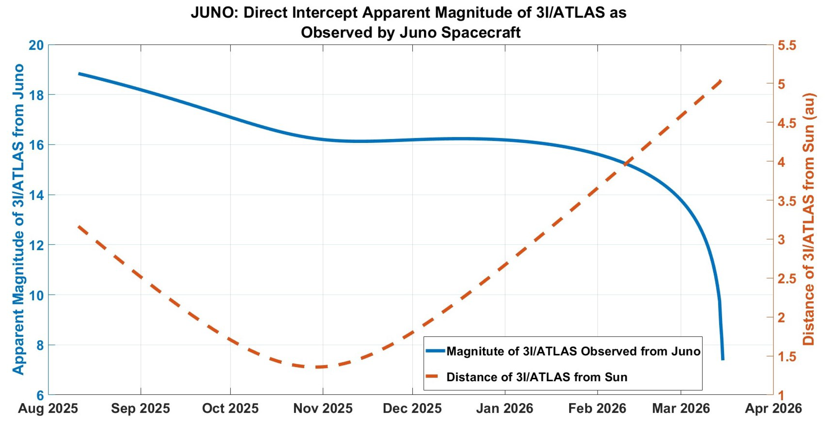 Estimated apparent brightness of 3I/ATLAS w.r.t. Juno (left axis) and distance of 3I/ATLAS from Sun (right axis) for reference mission.