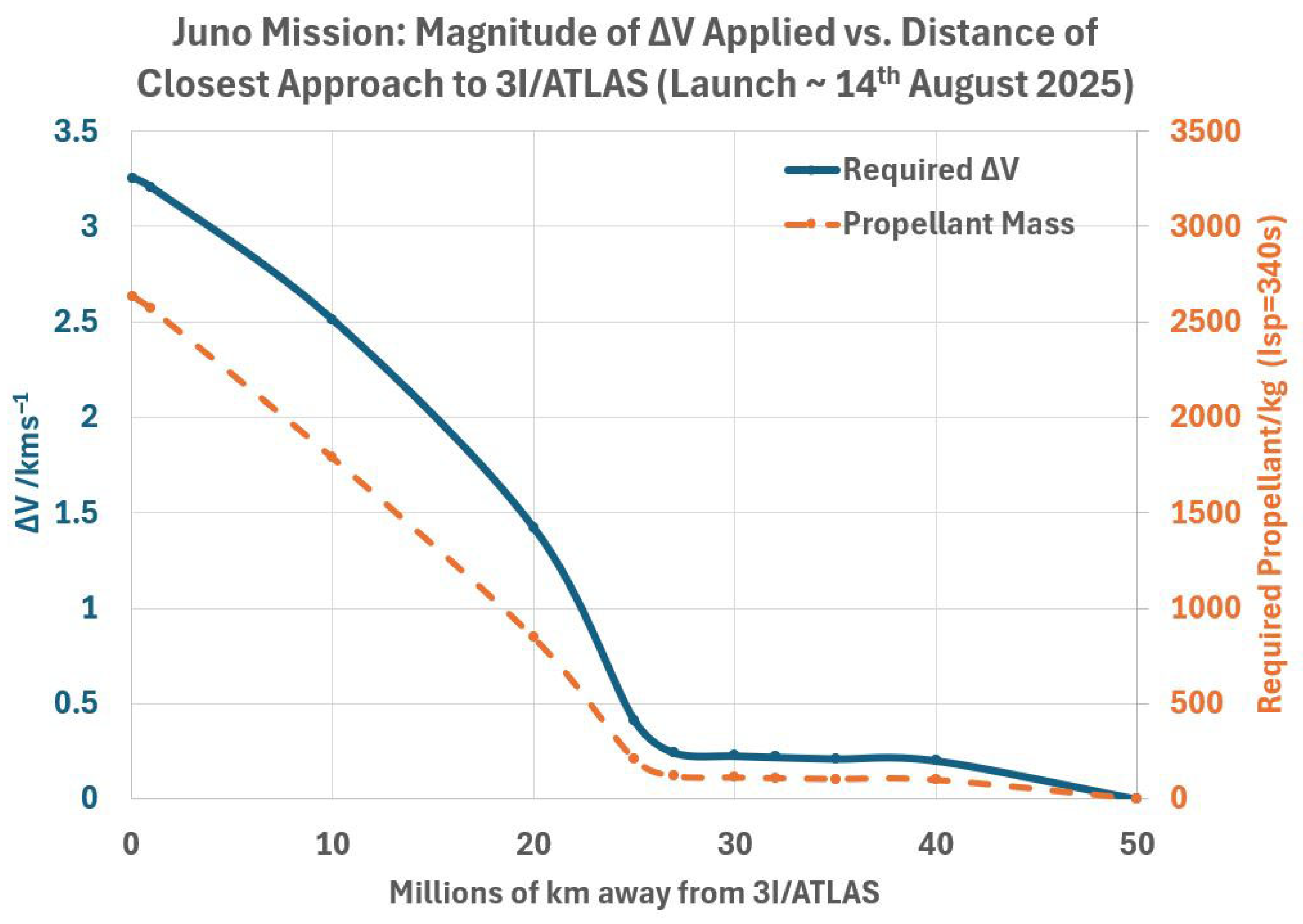 Thrust impulse V (left vertical axis) and propellant mass (right vertical axis) needed for Juno to come within a range of distances from 3I/ATLAS (horizontal axis). The launch date is assumed to be 14 August 2025.