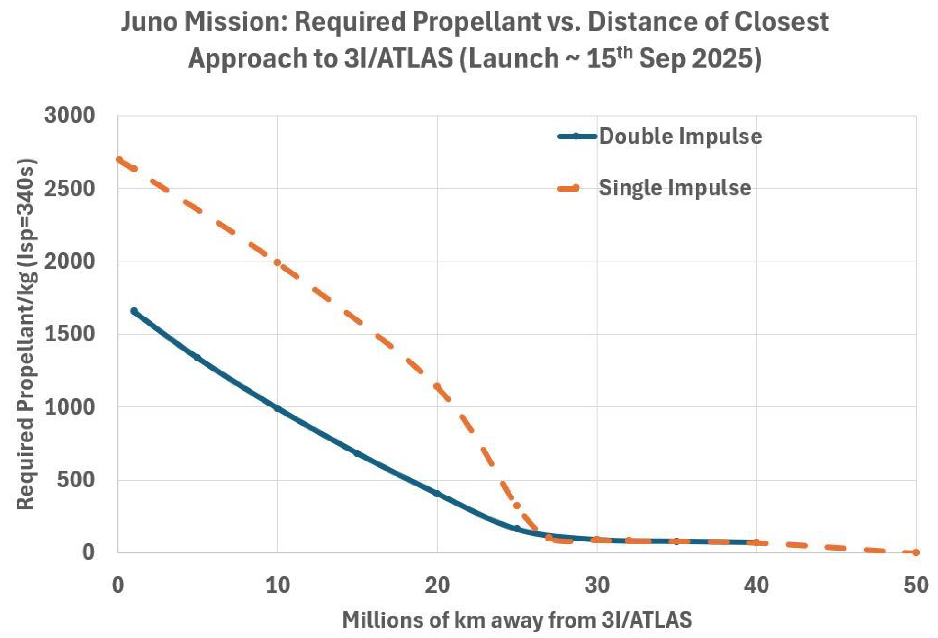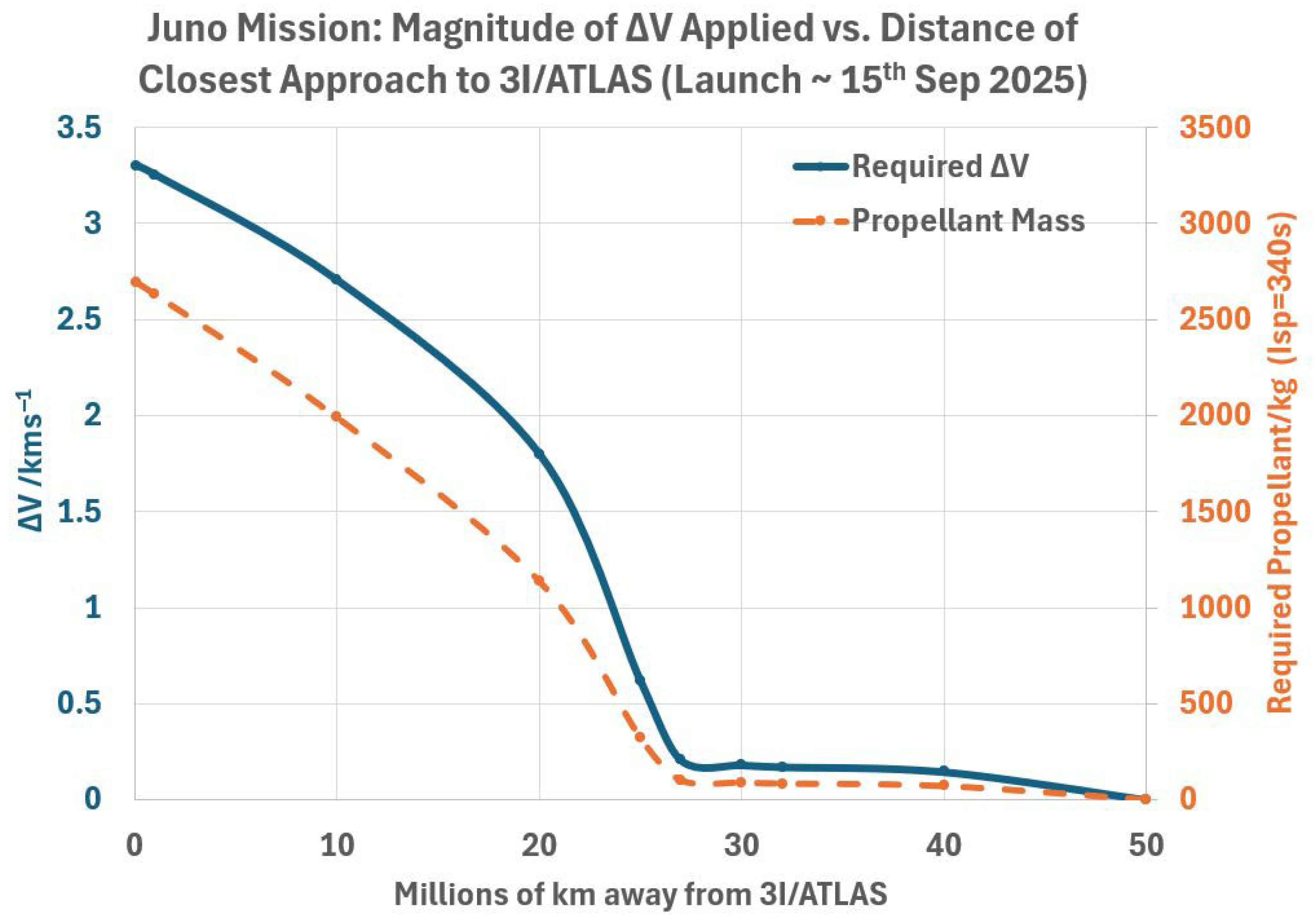 Thrust impulse V (left vertical axis) and propellant mass (right vertical axis) needed for Juno to come within a range of distances from 3I/ATLAS (horizontal axis). The launch date is assumed to be 15 September 2025.