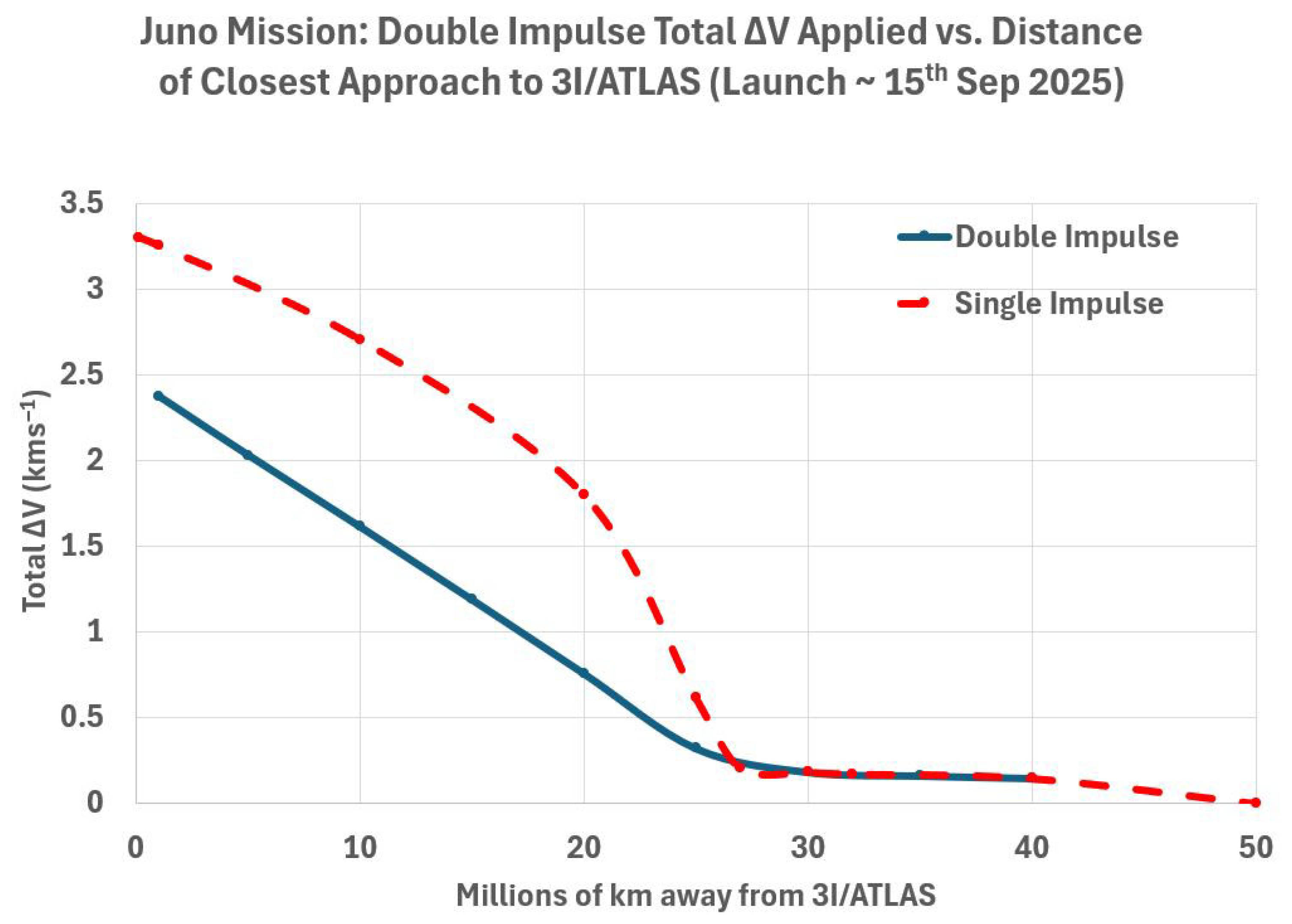 So far, we have examined a zero distance intercept of Juno with 3I/ATLAS. It is salient at this juncture to ask the question “how close can Juno approach 3I/ATLAS, given that it has a limited remaining propellant mass, and so a restricted V?”.