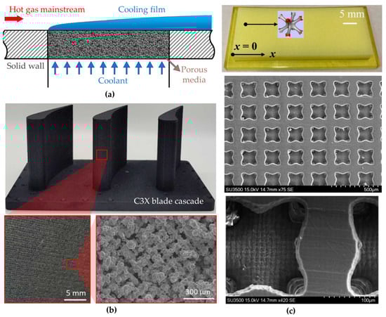 Additive manufacturing (AM) enables complex transpiration cooling designs with minimal material waste and high efficiency [12,13,14,15]. Recent studies also optimized the tool to improve the quality of the 3D-printed model, which was promising to obtain highly accurate printing results [16,17,18,19]. The current AM-fabricated structures exhibited greater tensile strength than sintered counterparts [20], although they might modify the flow characteristics and heat transfer performance due to the inherent increased roughness [21,22]. Tests on 3D-printed C3X turbine blades, as shown in Figure 1b, showed 34% and 25% higher cooling effectiveness than effusion and internal cooling, respectively [7,23]. Xu et al. [24] highlighted the potential of AM in fabricating microporous structures and optimizing transpiration cooling for gas turbine and aerospace applications. Overall, AM offers a promising pathway to develop high-performance transpiration cooling systems, bridging the gap between turbine operating temperatures and blade thermal limits.