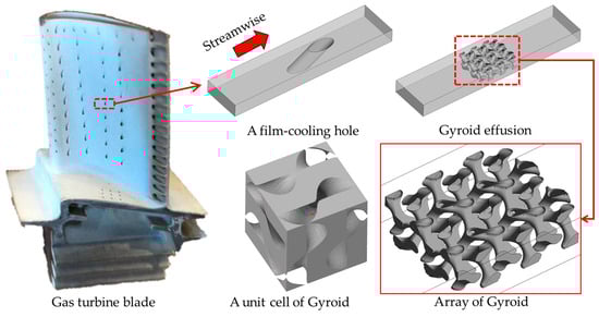 Despite these advances, research on the overall cooling effectiveness of TPMS-based transpiration cooling remains limited. Given this gap, this study investigates Gyroid-based TPMS structures for high-performance effusion cooling, leveraging their superior heat transfer and mechanical properties [12,13,14]. Impingement/effusion cooling designs are developed by integrating a jet impingement plate into all models. Using conjugate heat transfer simulations, the flow characteristics, pressure loss, and overall cooling effectiveness of the Gyroid effusion cooling unit and a baseline film hole model are compared at blowing ratios (BRs) of 0.5–2.0. Moreover, high-resolution CT scanning is used to assess the manufacturability of the Gyroid effusion sample, ensuring feasibility for industrial implementation.