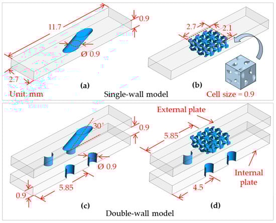 Figure 3 shows the numerical model of the single- and double-wall unit configurations for different cooling designs: film hole in Figure 3a and Gyroid-TPMS effusion in Figure 3b. The double-wall configuration includes external and internal plates, while the single-wall one only has an external plate. For all studied configurations, the size of both plates is 2.7 mm × 11.7 mm × 0.9 mm in width, length, and thickness. The diameter of the film hole is 0.9 mm. The hole of the film hole model is tilted at an angle of 30 degrees.