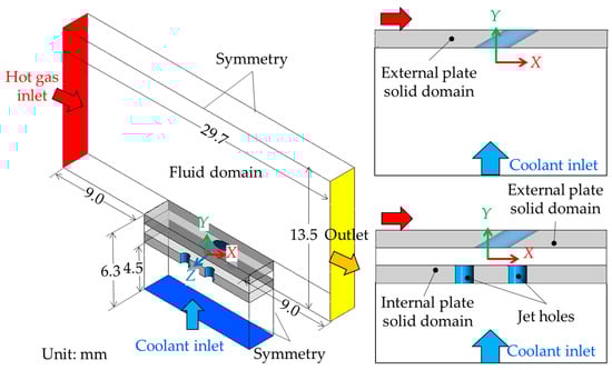 The unit model used in this study is derived from the film-cooling section of a gas turbine blade, as shown in Figure 2. Since film-cooling holes are typically arranged in streamwise and spanwise directions on turbine blades, the downstream wall in this investigation is designed to be shorter than those used in various other film-cooling studies that focus on the adiabatic film cooling effectiveness [38]. Several film-cooling studies have employed similar unit configurations [39,40].