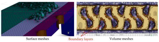 Fluent Meshing is utilized to generate poly-hexagon-shaped and prism-shaped meshes in order to discretize the computational domain. Figure 5 illustrates an example of mesh systems of the double-wall configuration with the Gyroid design. Most elements within the solid and fluid domains are hexagonal elements, while the prism-shaped meshes are densely generated near all the no-slip surfaces to ensure that the y+ values remain below 1.0. Boundary layers occur on symmetry boundaries to facilitate grid generation for the model. These boundaries are later changed to the symmetry condition before calculations. In all models, the target skewness values for the surface and volume mesh are set at 0.8 and 0.96, respectively. It is essential to mention that the SST k-ω turbulence model is employed in this simulation to obtain the most accurate results, as the heat transfer calculated using this turbulence model has shown good agreement with various experimental data [46,47].